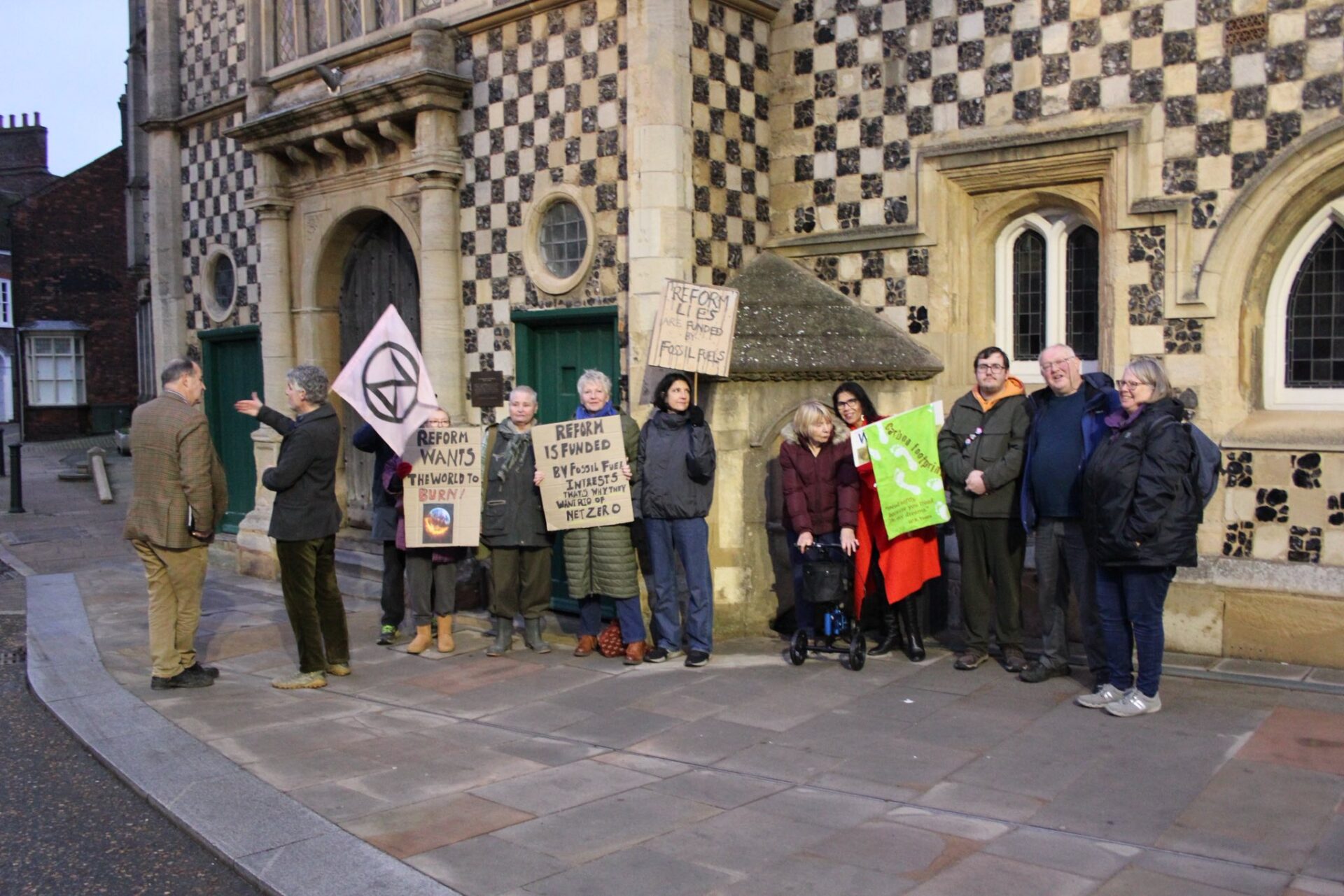 Before the meeting, 16 campaigners from Extinction Rebellion King’s Lynn and other groups gathered at the King’s Lynn town hall to peacefully demonstrate and express opposition to Reform’s climate wrecking motion. We spoke to many councillors as they arrived to enter the hall for the meeting, most of whom supported tackling climate change and so were against Reform’s motion.